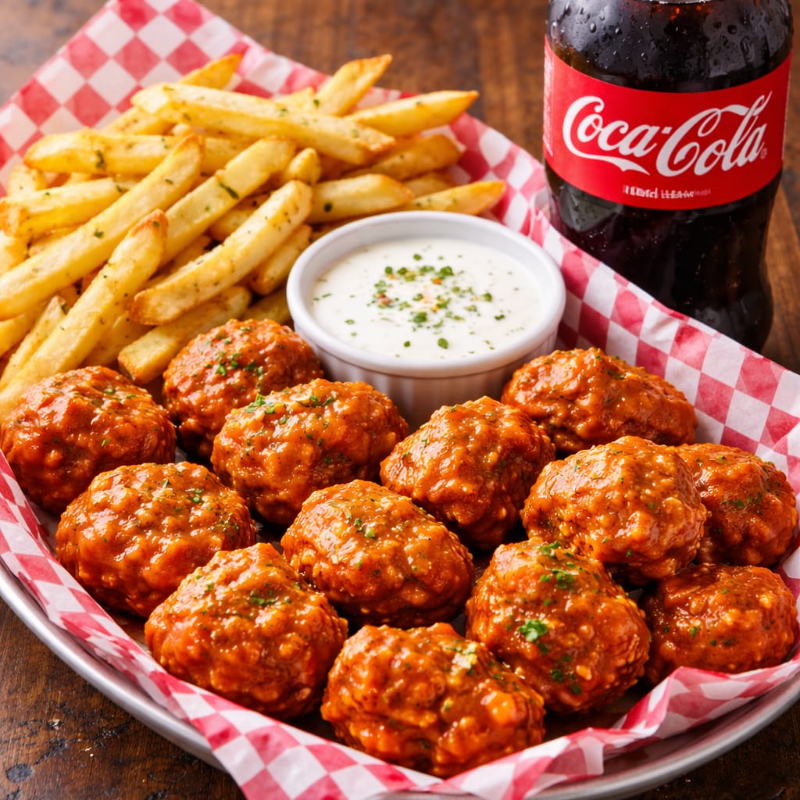Ricos boneless bañados en tu salsa favorita,aderezo +papas a la francesa+refresco