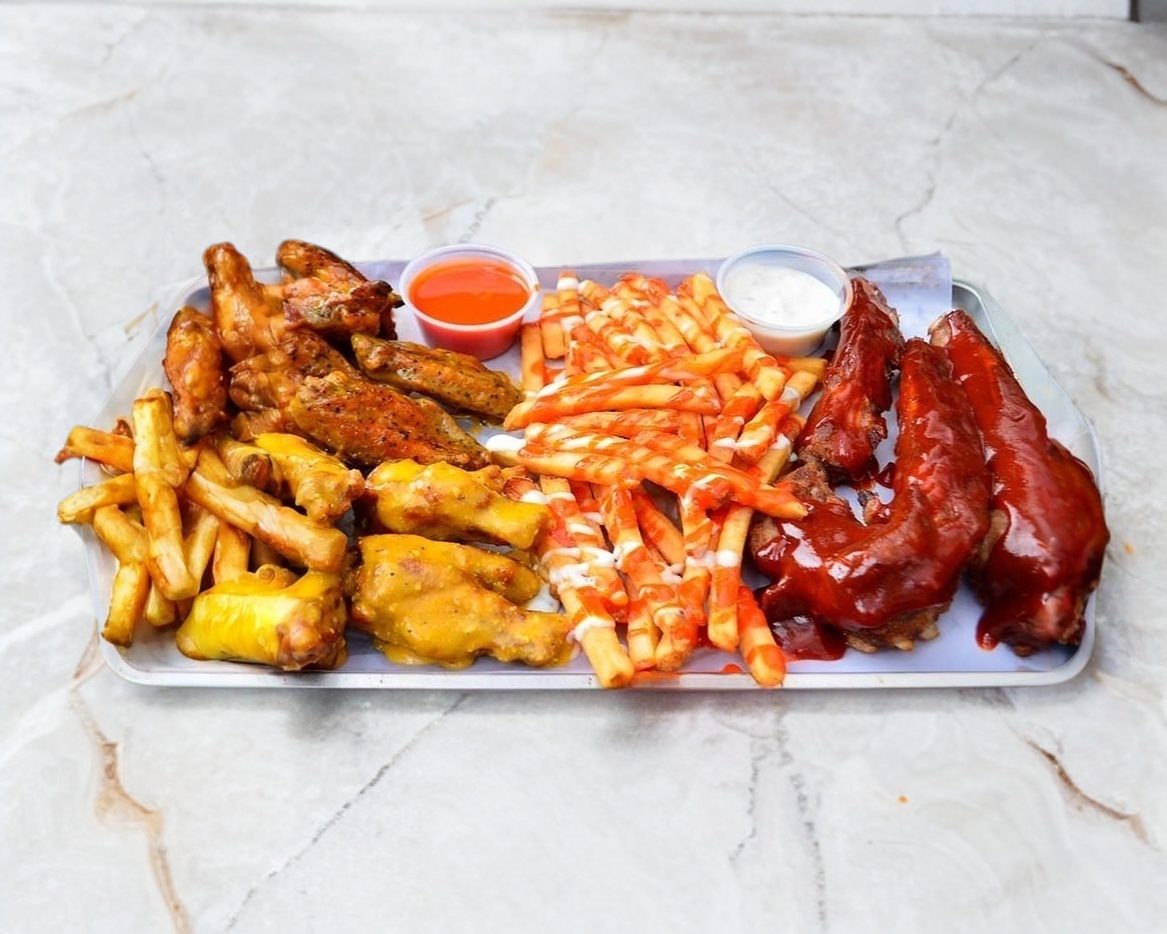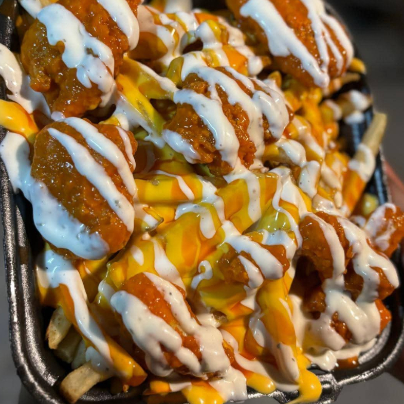 250grm de alitas 250grm de boneles bañados de salsa a elegir incluye ranch papas fritas zanahoria apio