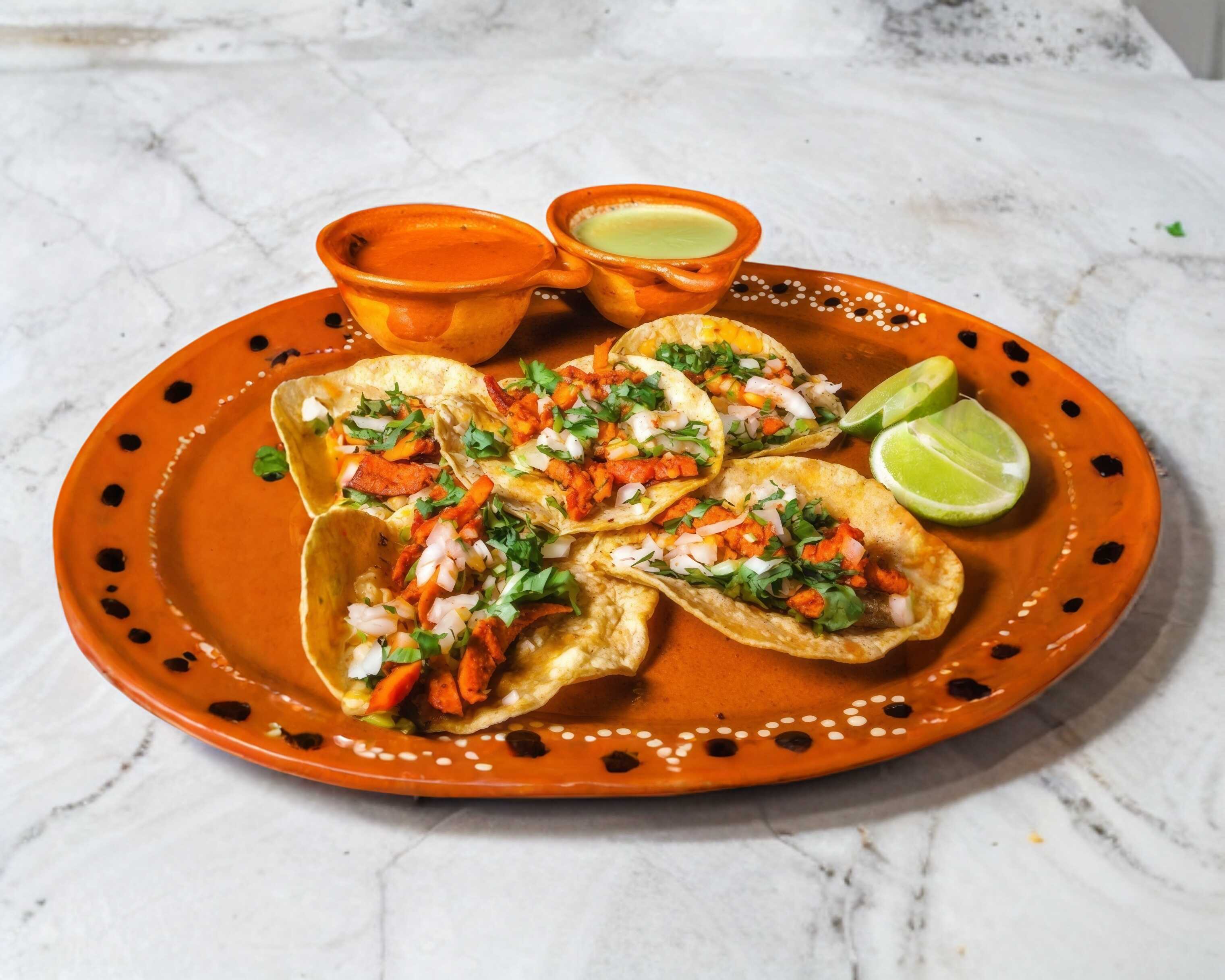 5 taquitos de alpastor incleye cebolla asada salsa verde y roja limon