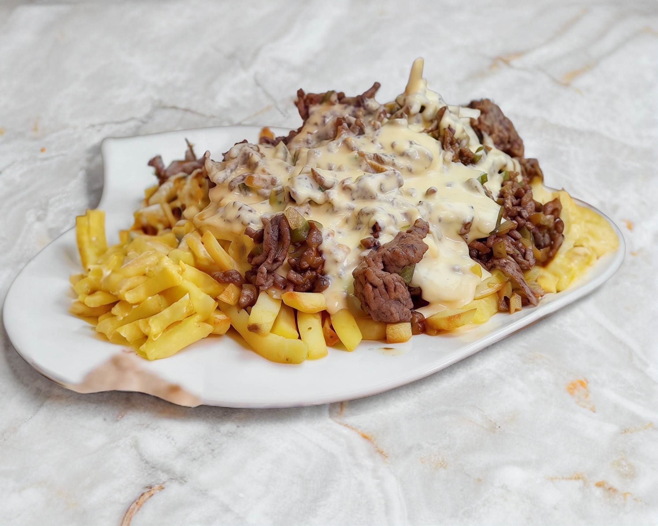 Orden de papas fritas con bolsa de queso amarillo y capsu