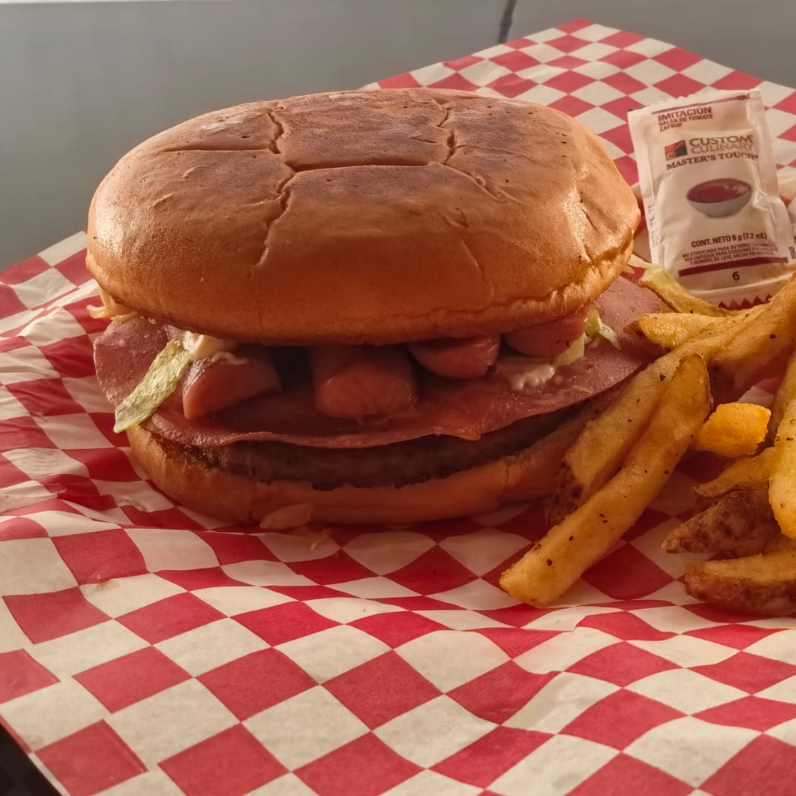 Deliciosa hamburguesa preparada con carne de 100gr acompañada con queso tipo americano, jamon, salchicha y aderezos.