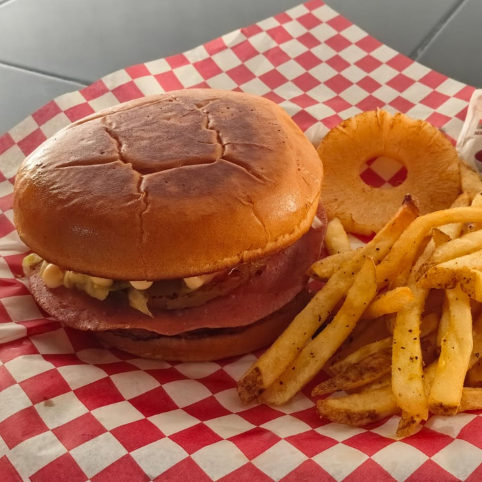 Deliciosa hamburguesa con carne de 100gr acompañada con queso tipo americano, jamon, piña, vegetales y aderezos.
