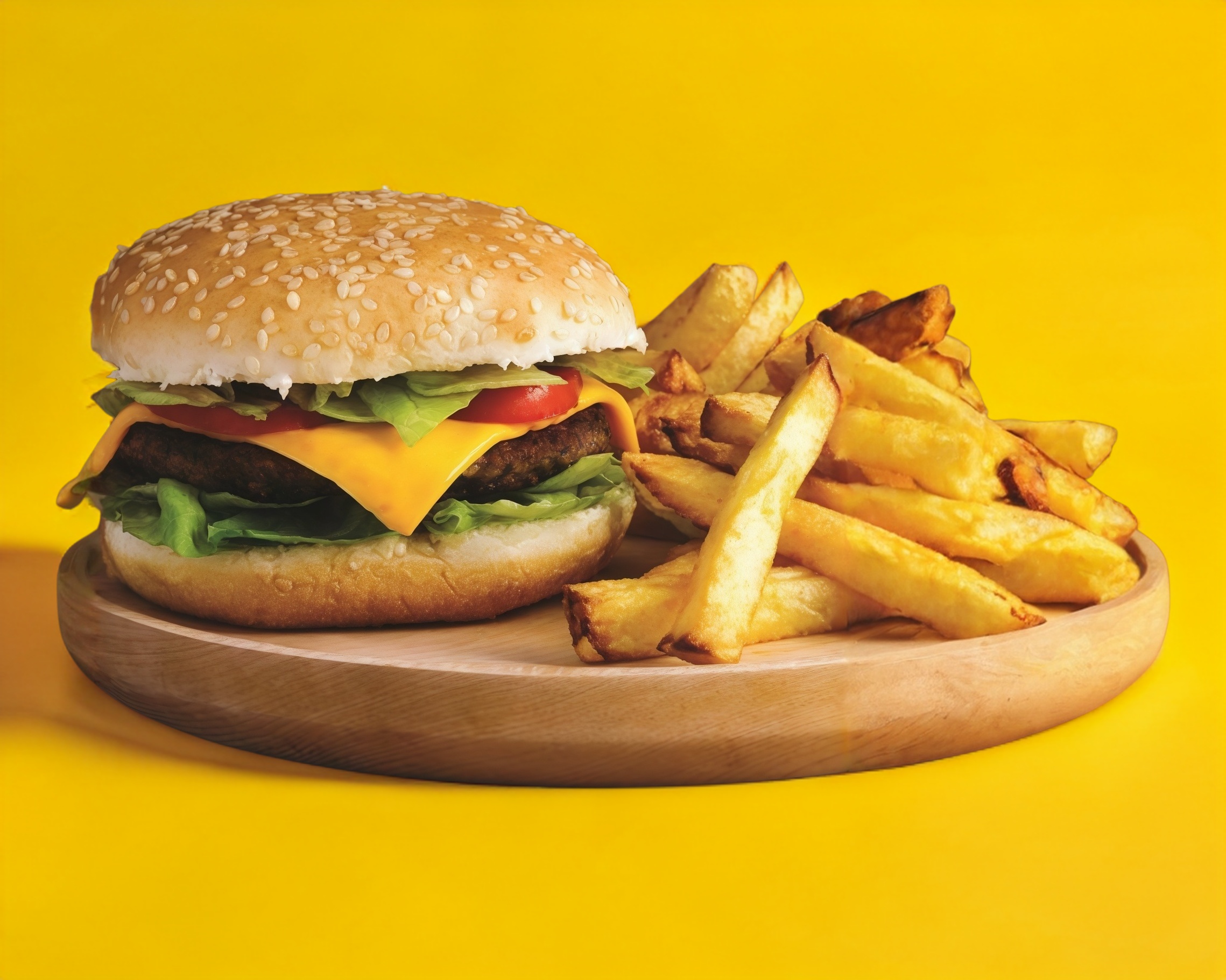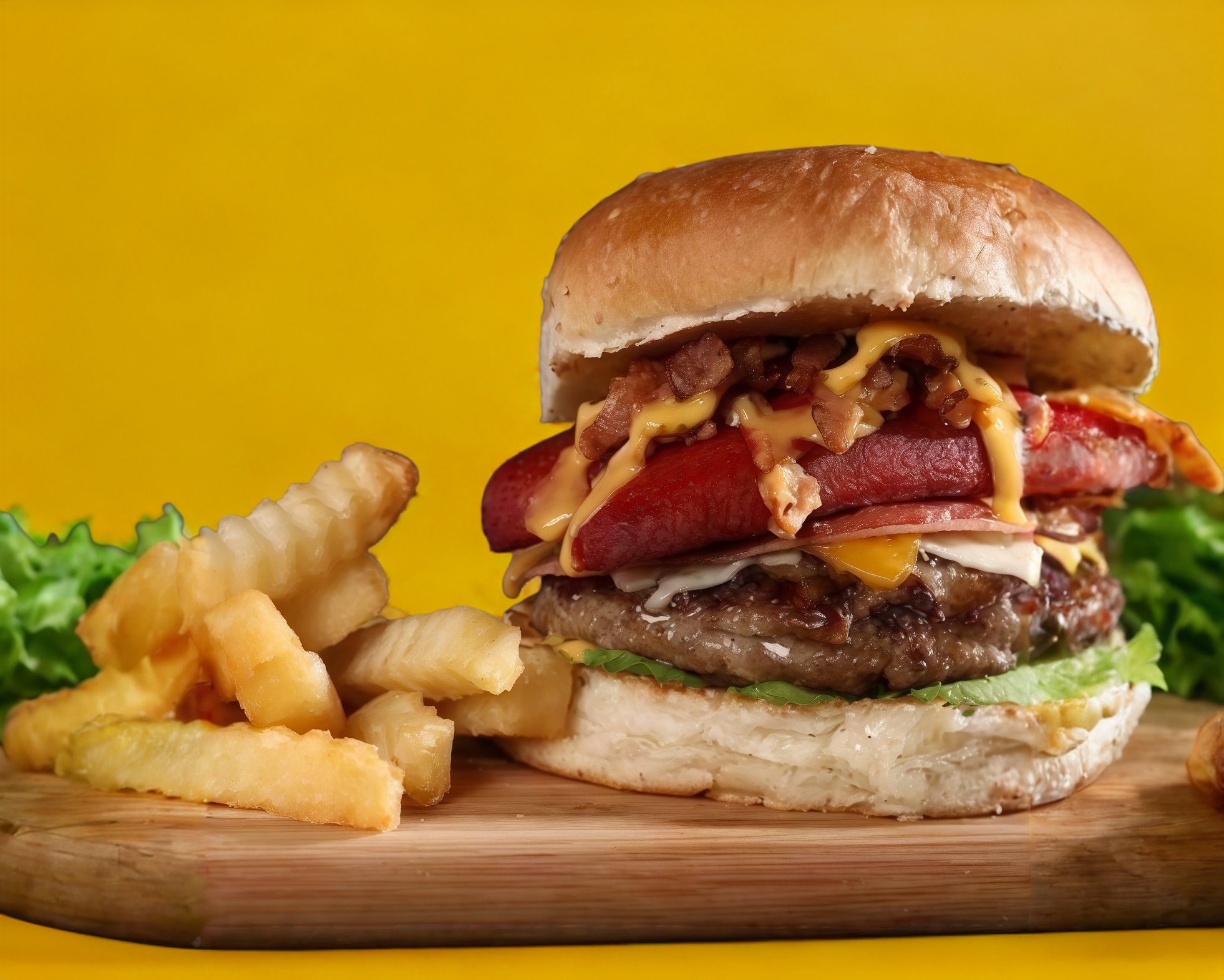 Carne de res, jamón, tocino, queso amarillo acompañado de papas.
