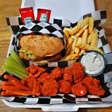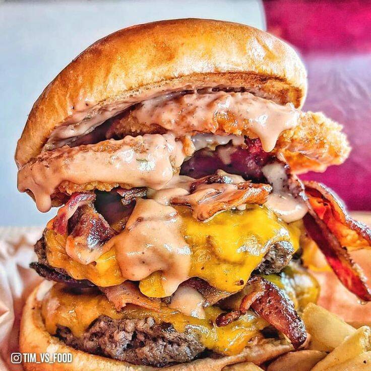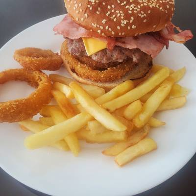 hamburguesa de res,tocino,pepinillos y aros de cebolla cañados en salsa bbq mas papas
