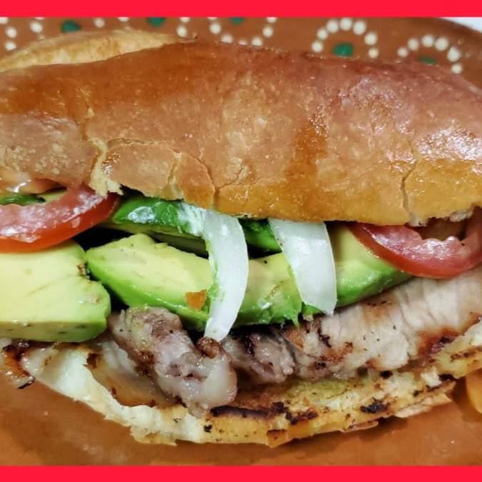torta de pierna ala plancha con aguacate,lechuga,tomate,cebolla,crema,catchup,mayonezay chile jalapeño