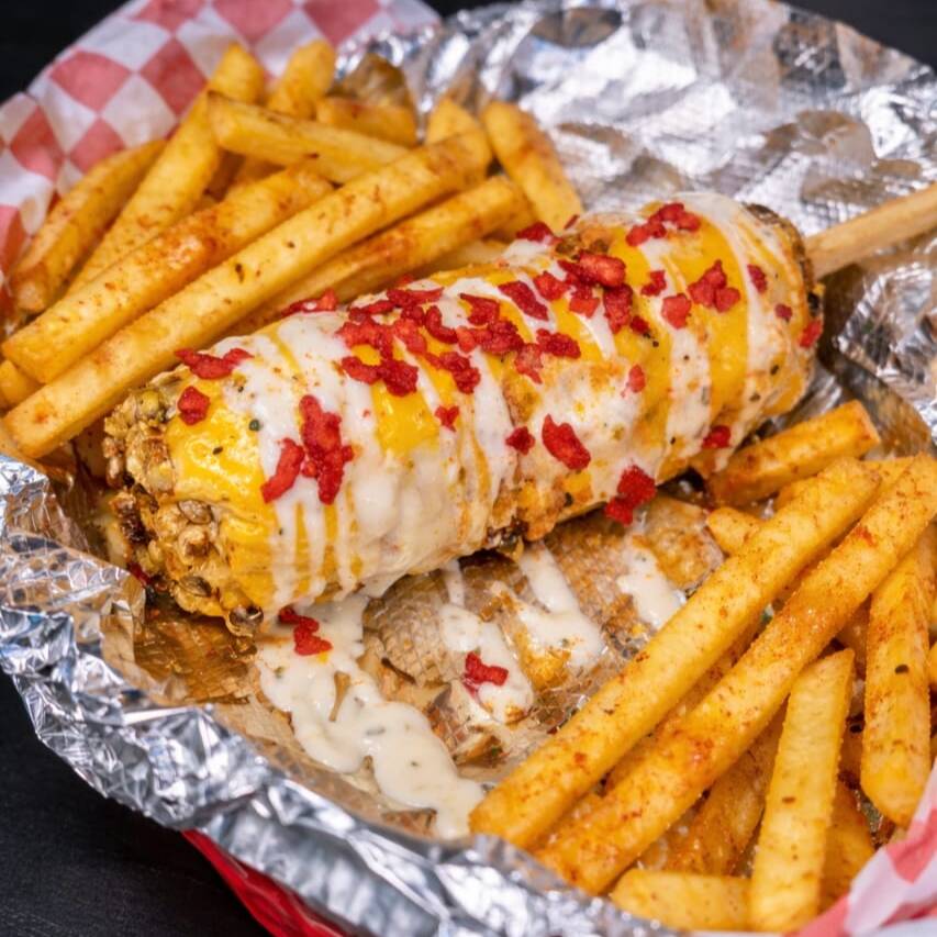 ELOTE DULCE PREPARADO CON ADEREZOS ,QUESO AMARILLO, TOCINO Y PAPAS ALA FRANCESA