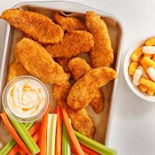 papas criscut con pechuga de pollo enpanizada bañada con salsa bufalo queso amarillo y adereso ranch