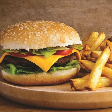 hamburguesa de res,tocino,queso amarillo, pepinillos,lechuga,jitomate y aros de cebolla acompañado de papas