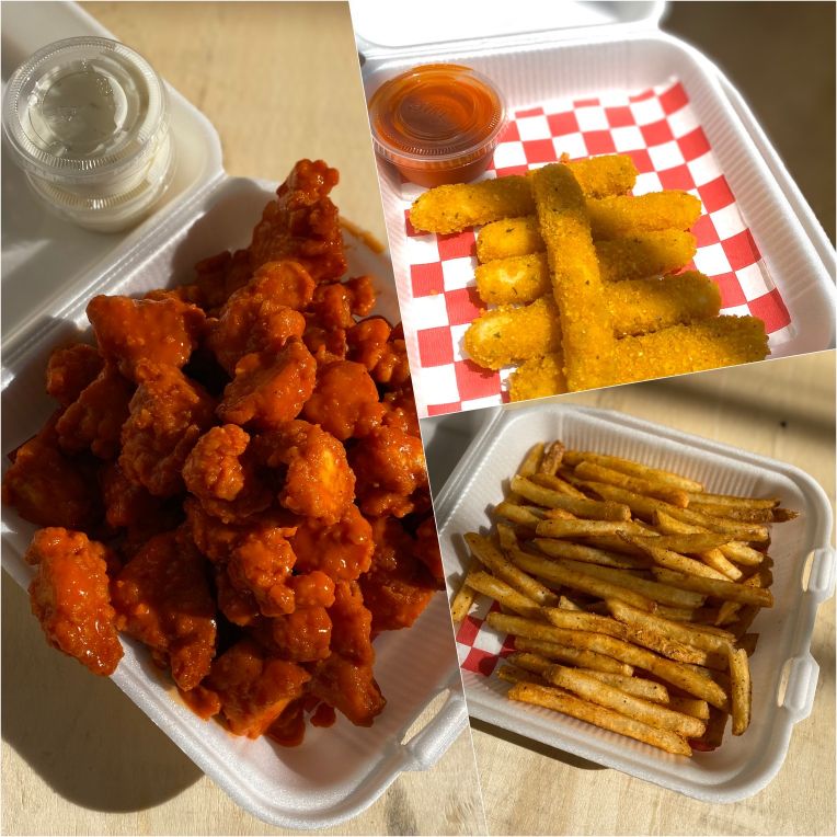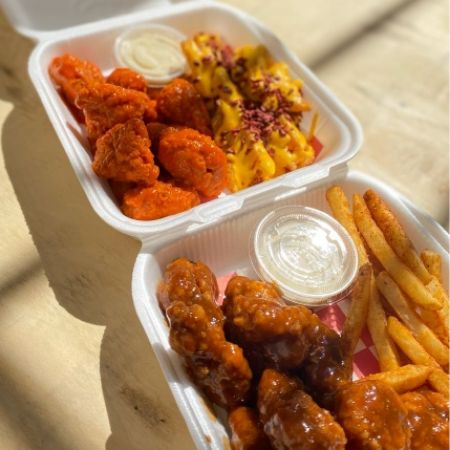 Pan brioche, boneless bañados en salsa buffalo, queso, mayonesa, ranch, lechuga y tomate.