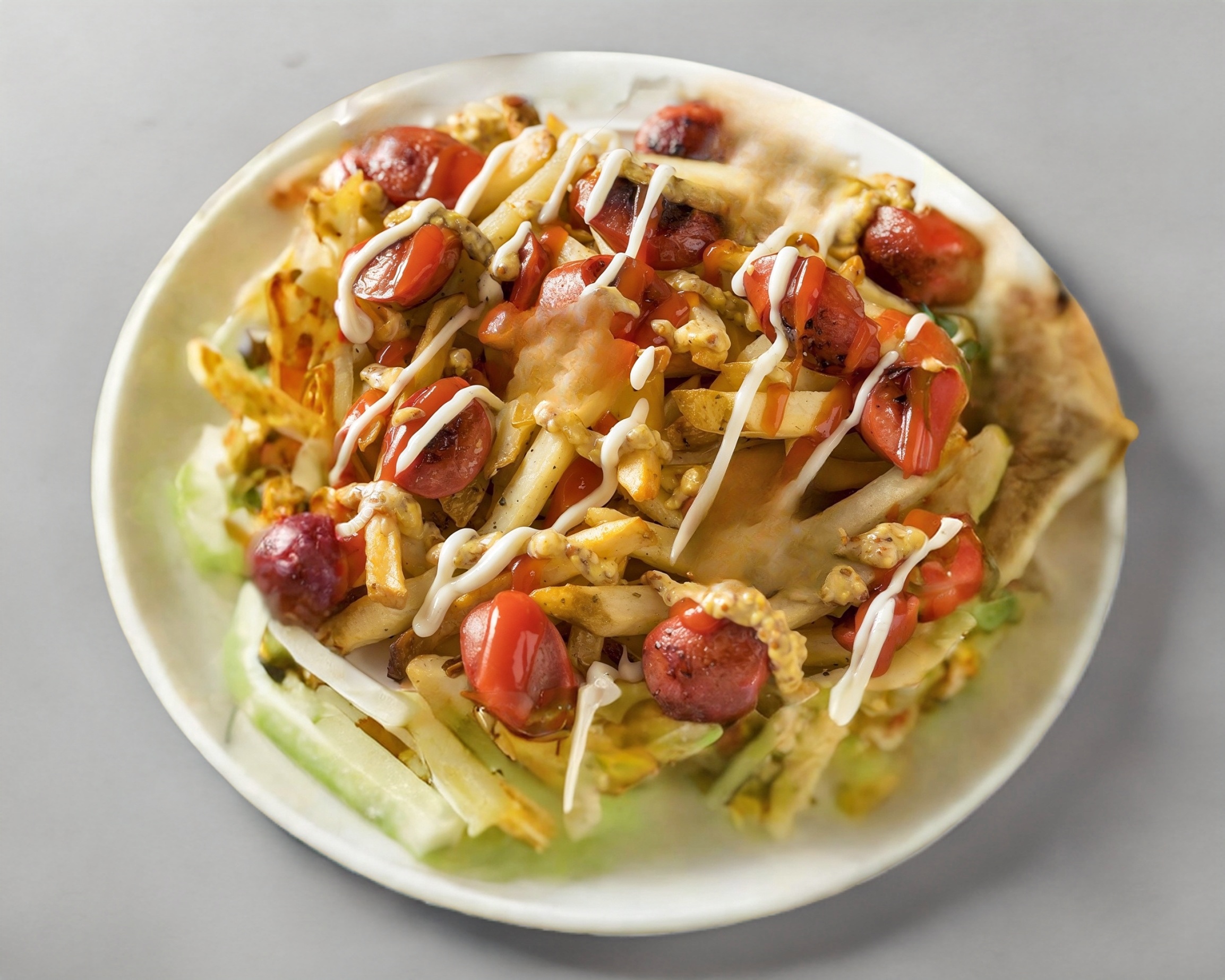 Carne arrachera, salchicha para asar roja, pan a elegir, aguacate, lechuga, tomate, cebolla morada, queso, jamón y mayonesa mas pequeña porción de papas mas chiles jalapeños.