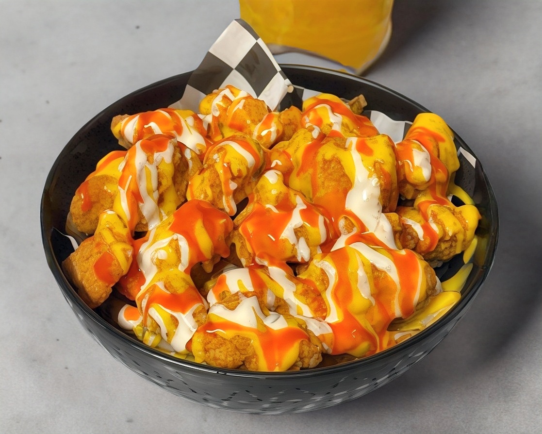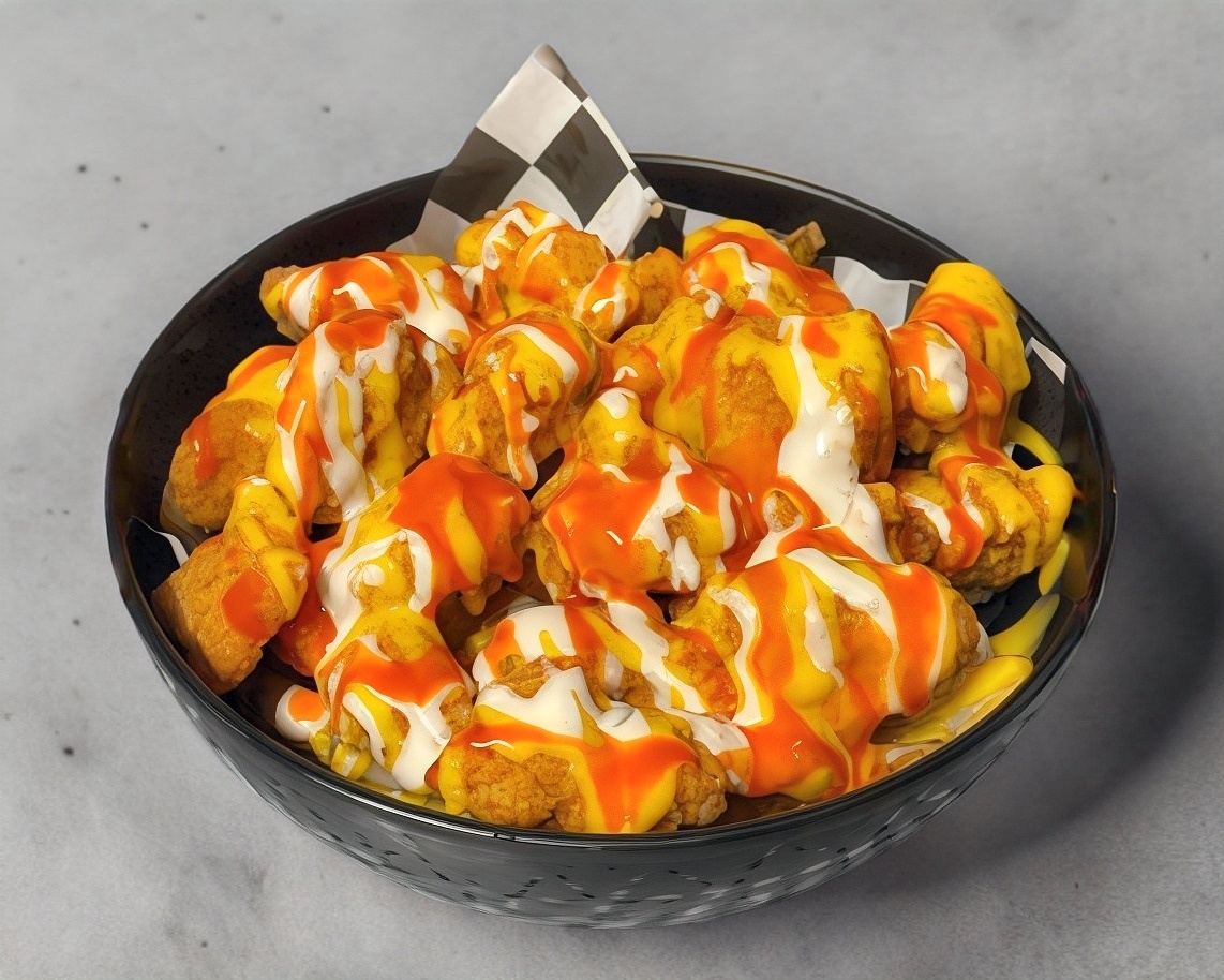 30 Bonelessitos, con cama de papas a la francesa, todo bañado con queso, búfalo y ranch.