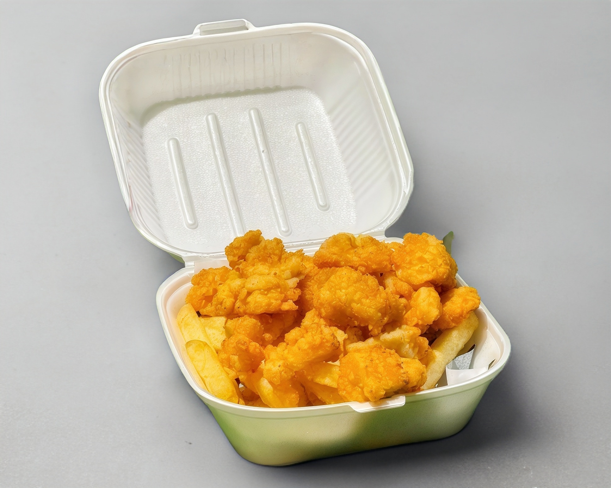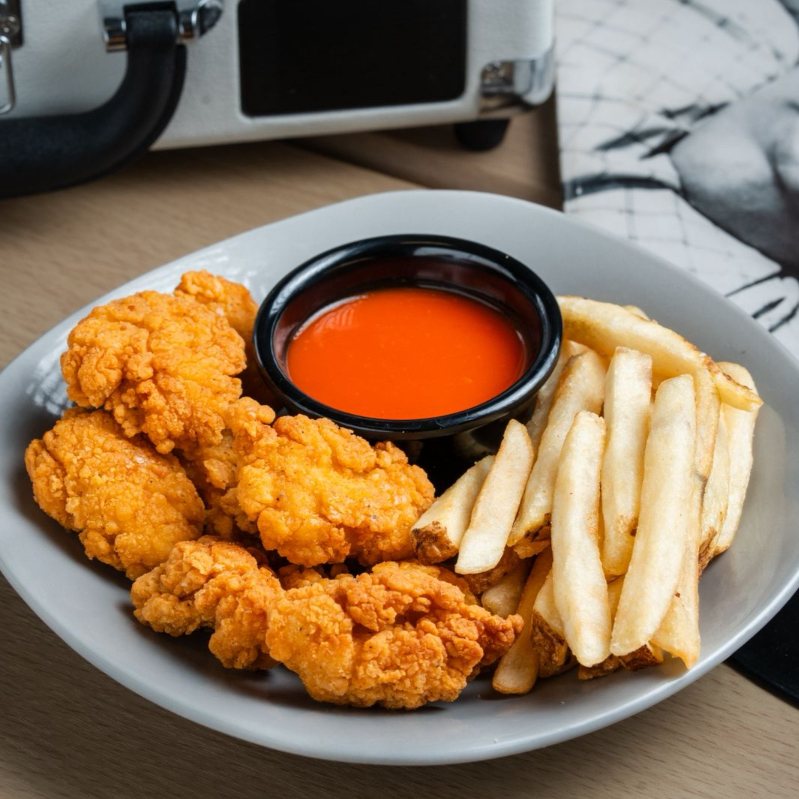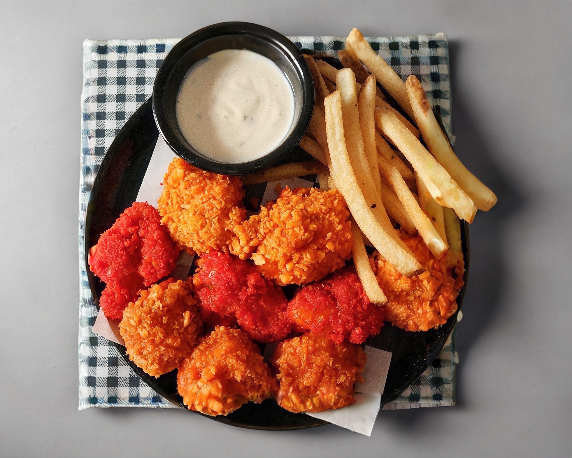 8 Boneless primeramente bañados en salsa Búfalo y cubiertos, empanizados de papitas de tu preferencia mas pequeña porción de papas a la francesa mas aderezo y salsa a elegir.