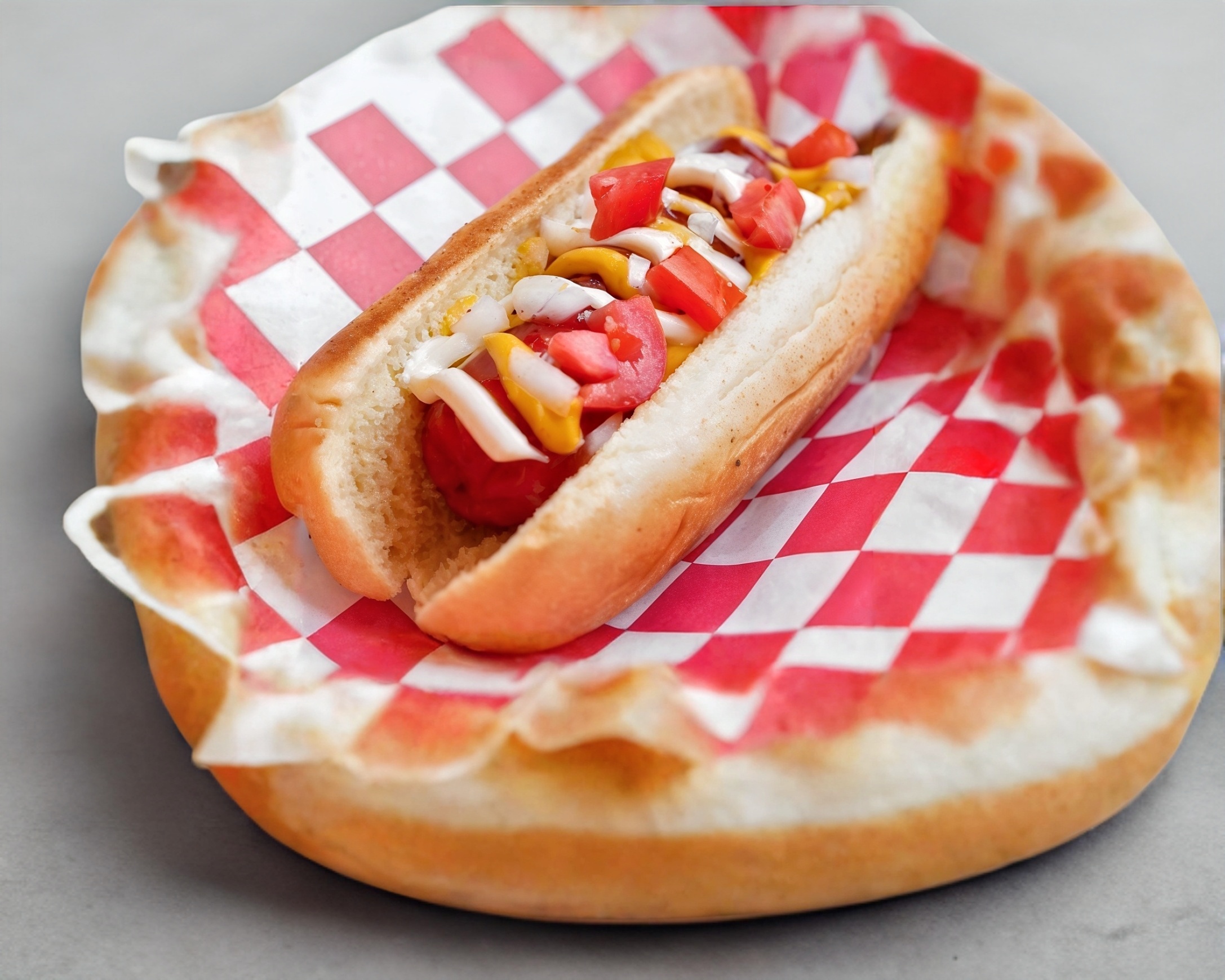 Pan de hotdog jumbo, con salchicha roja, mayonesa, incluye porción de papas a la francesa, tomate y jalapeños