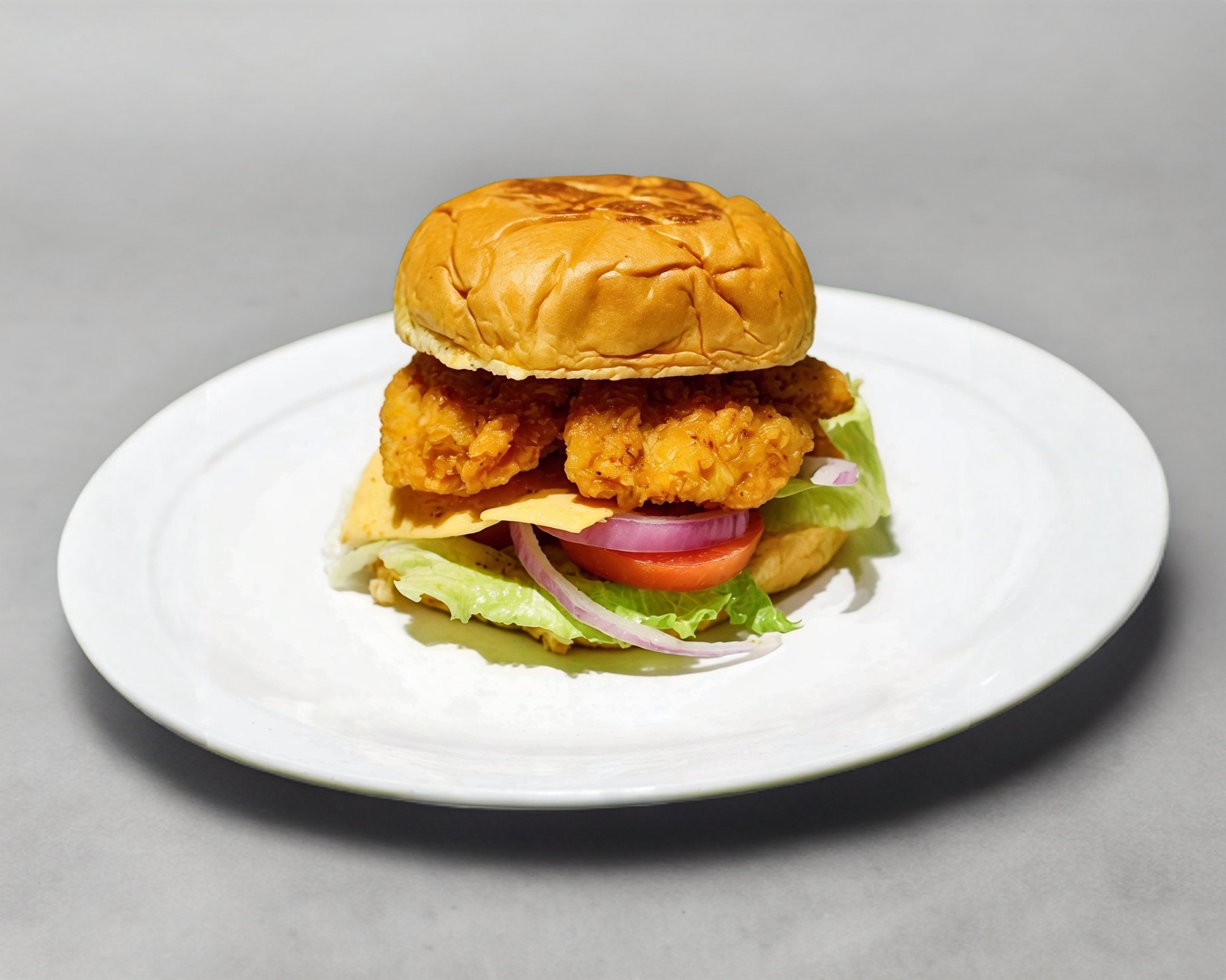 Hamburguesa con boneless bañada en salsa (lechuga, tomate, cebolla, boneless, queso, aderezo búfalo ranch) mas pequeña porción de papas a la francesa.