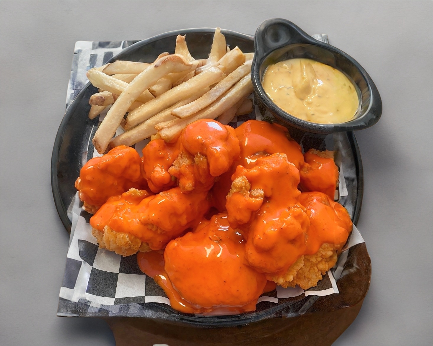 12 Boneless bañados con salsa búfalo y empanizados con papitas surtidas, incluye 1 orden de papas a la francesa.