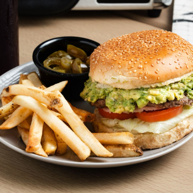 Carne arrachera, guacamole, pan a elegir, aguacate, lechuga, tomate, cebolla morada, queso, jamón y mayonesa mas pequeña porción de papas mas chiles jalapeños.