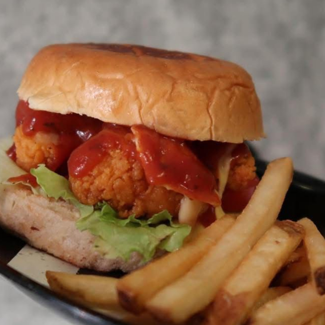 Hamburguesa con boneless, salsa de pizza y queso gouda(lechuga, tomate, cebolla, boneless, queso, aderezo búfalo ranch) mas porción de papas a la francesa.