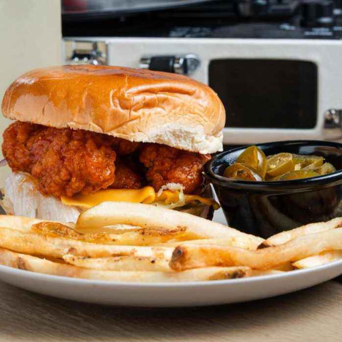Hamburguesa con boneless (lechuga, tomate, cebolla, boneless, queso, aderezo búfalo ranch) mas pequeña porción de papas a la francesa.