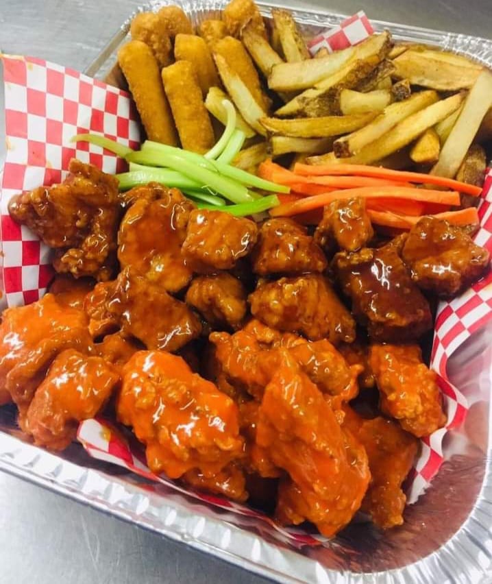 1 kilo de boneless 4 salsas a elegir 4 aderezo ranch 500 gr de crujientes papas francesas 4 dedos de queso 4 jalapeño poppers.