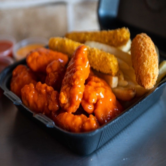 250 gr de exquisitos boneless acompañados de 150 gr de crujientes papas a la francesa, 1 jalapeño popper y 2 dedos de queso. con la salsa de tu elección.