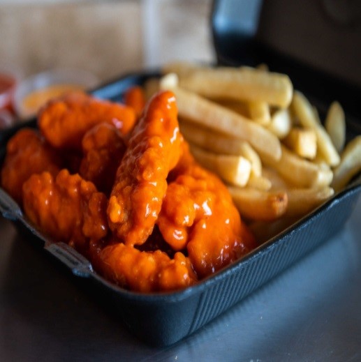 500 gr de exquisitas tiras de pollo empanizadas acompañados de 200 gr de crujientes papas a la francesa, 2 jalapeño popper y 2 dedos de queso. con la salsa de tu elección.