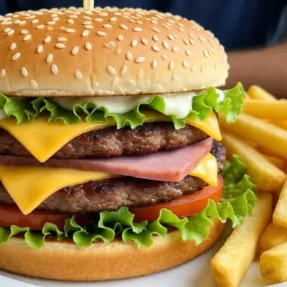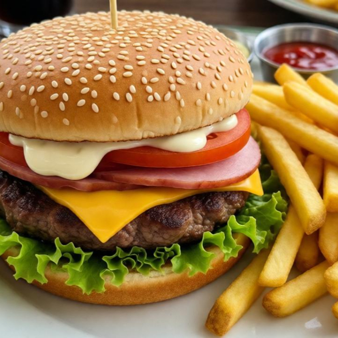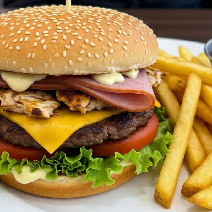 Pan de ajonjolí carne de res y pollo jamón queso tomate lechuga y mayonesa ketchup papa a la francesa.