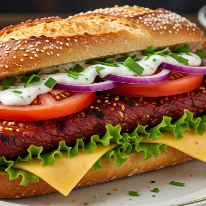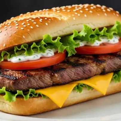 Pan de telera con carne de bistec lechuga tomate aderezo ranch y queso.