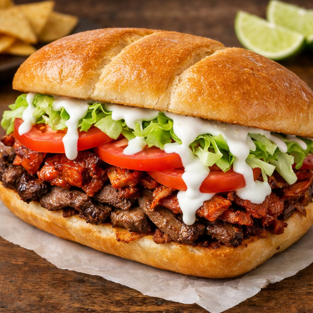 Pan de telera con carne de bistec y carne de trompo lechuga tomate aderezo ranch y queso.