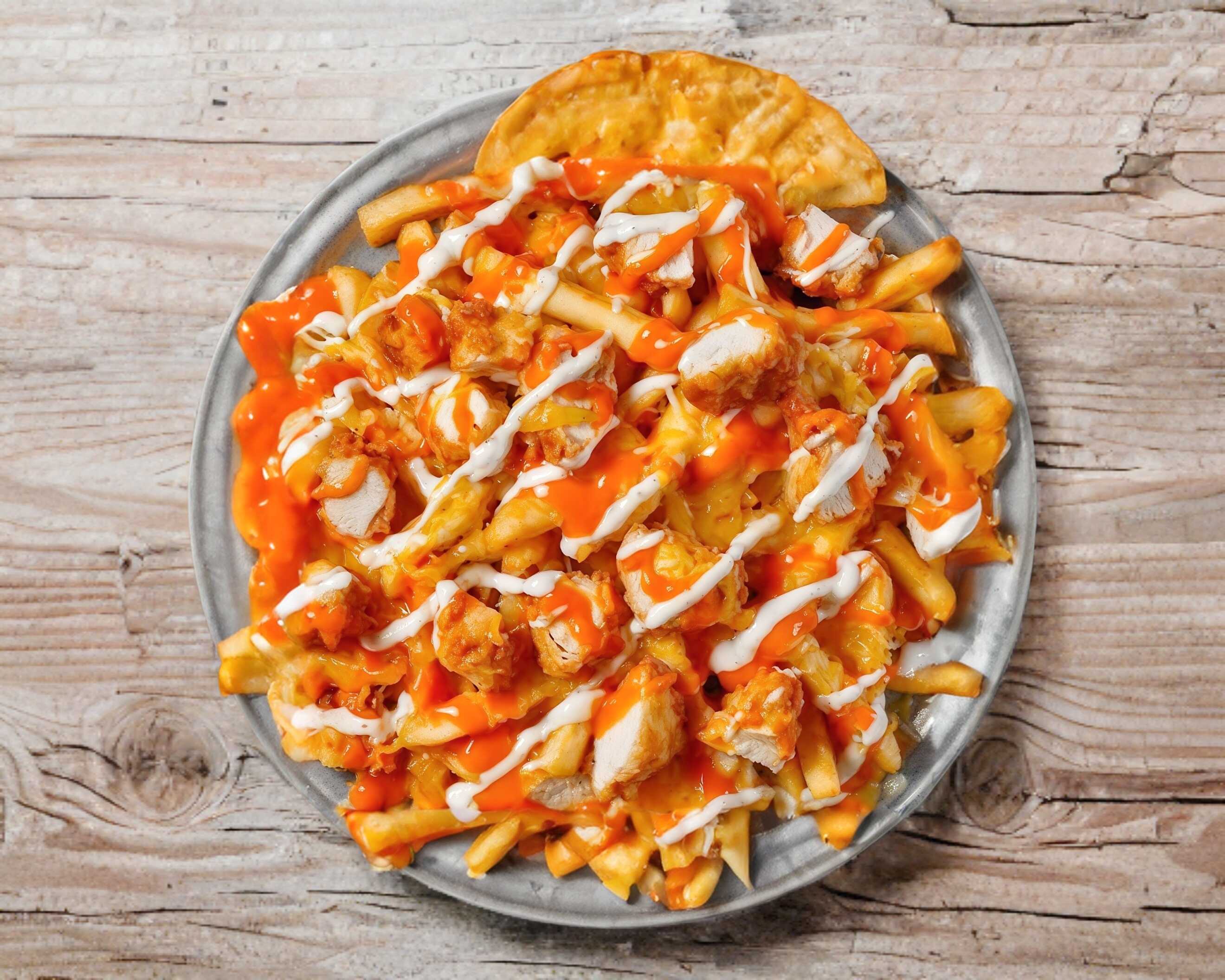 Papas a la francesa,con trocitos de bonelles,ranch, queso,salsa