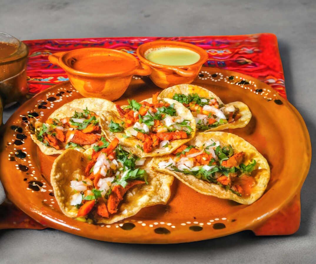 5 tacos de trompo con su cebolla asada y cebolla y cilantro salsa verde y roja y limon