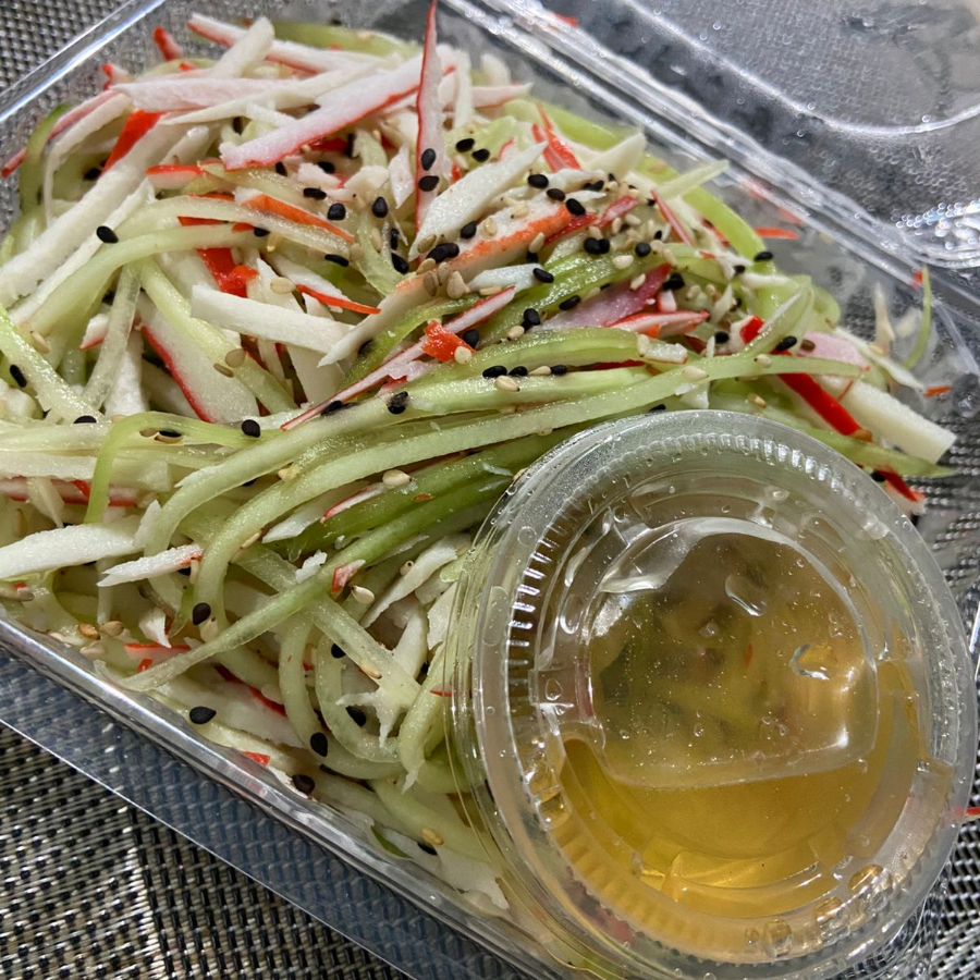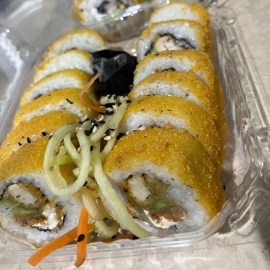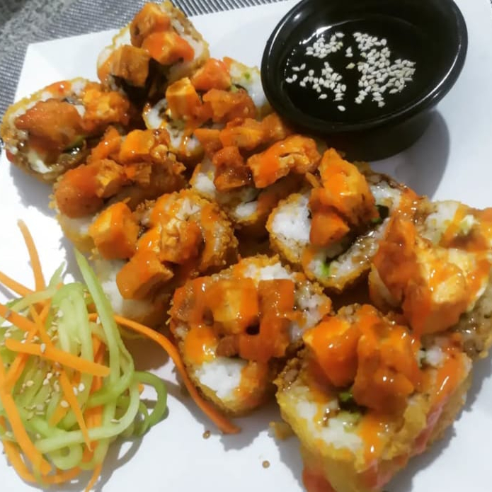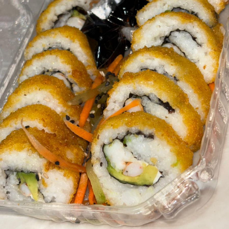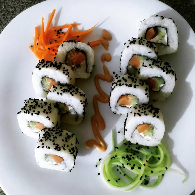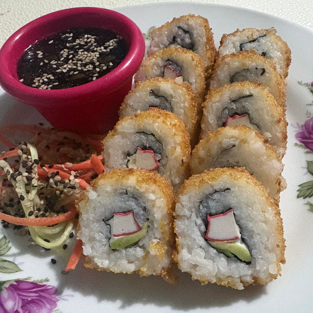 Surimi,aguacate y pepino por dentro, ajonjoli por fuera.