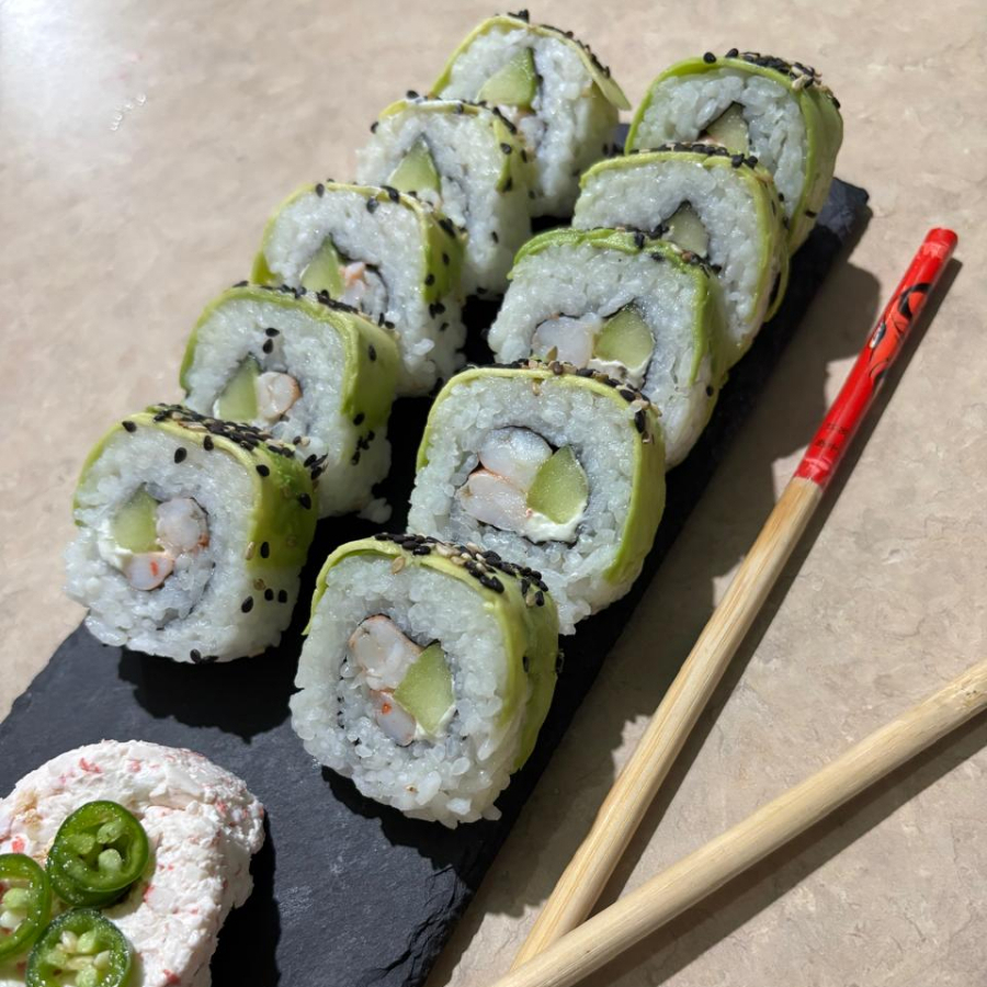 Camaron,queso crema y pepino por dentro, aguacate por fuera