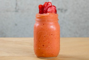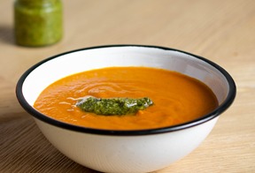 Deliciosa sopa hecha 100% de tomate rostizado lentamente al horno. Se acompaña con un toque de pesto hecho en casa y queso parmesano rallado.