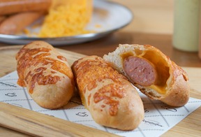 Salchicha polaca con queso cheddar.