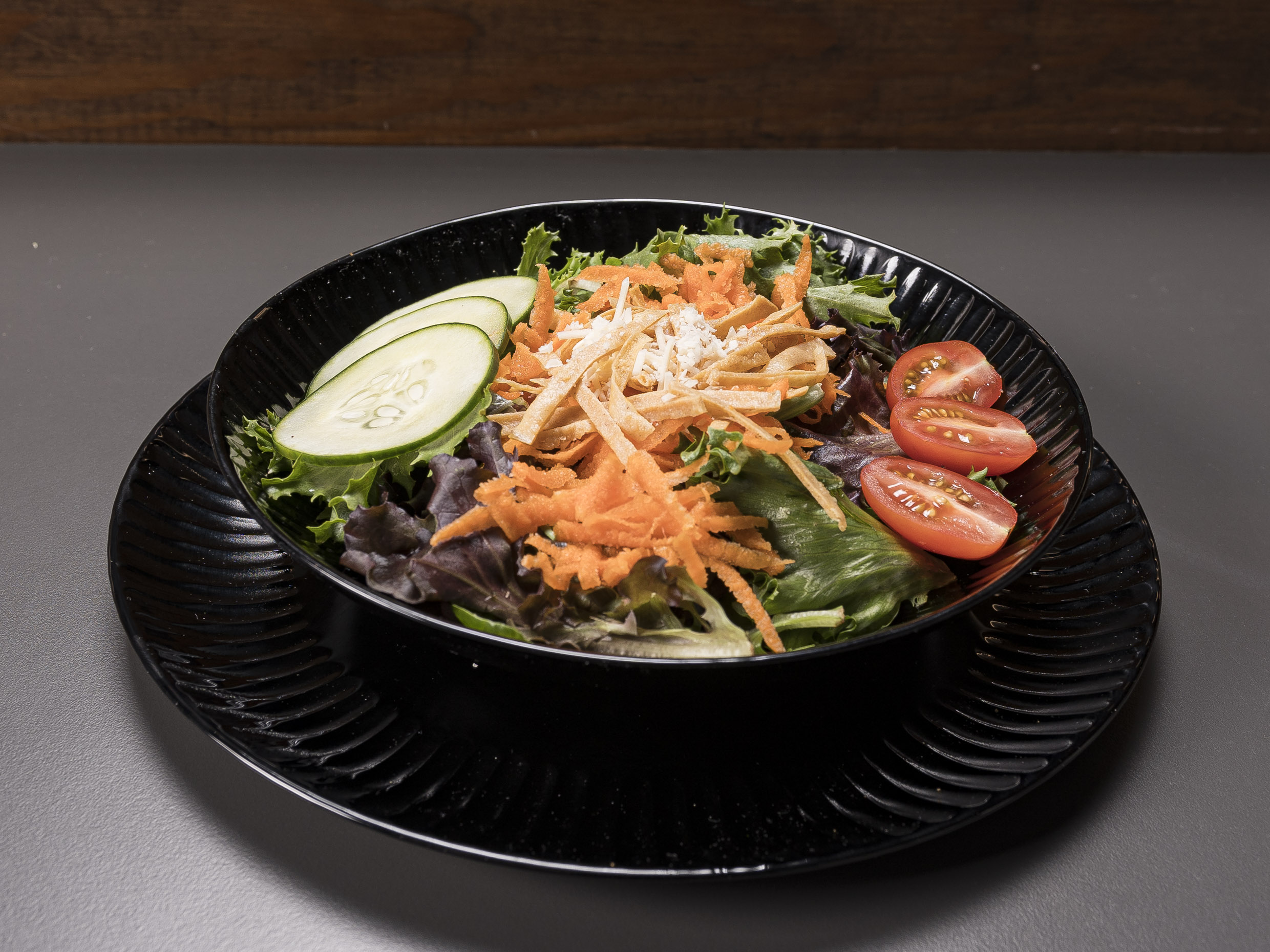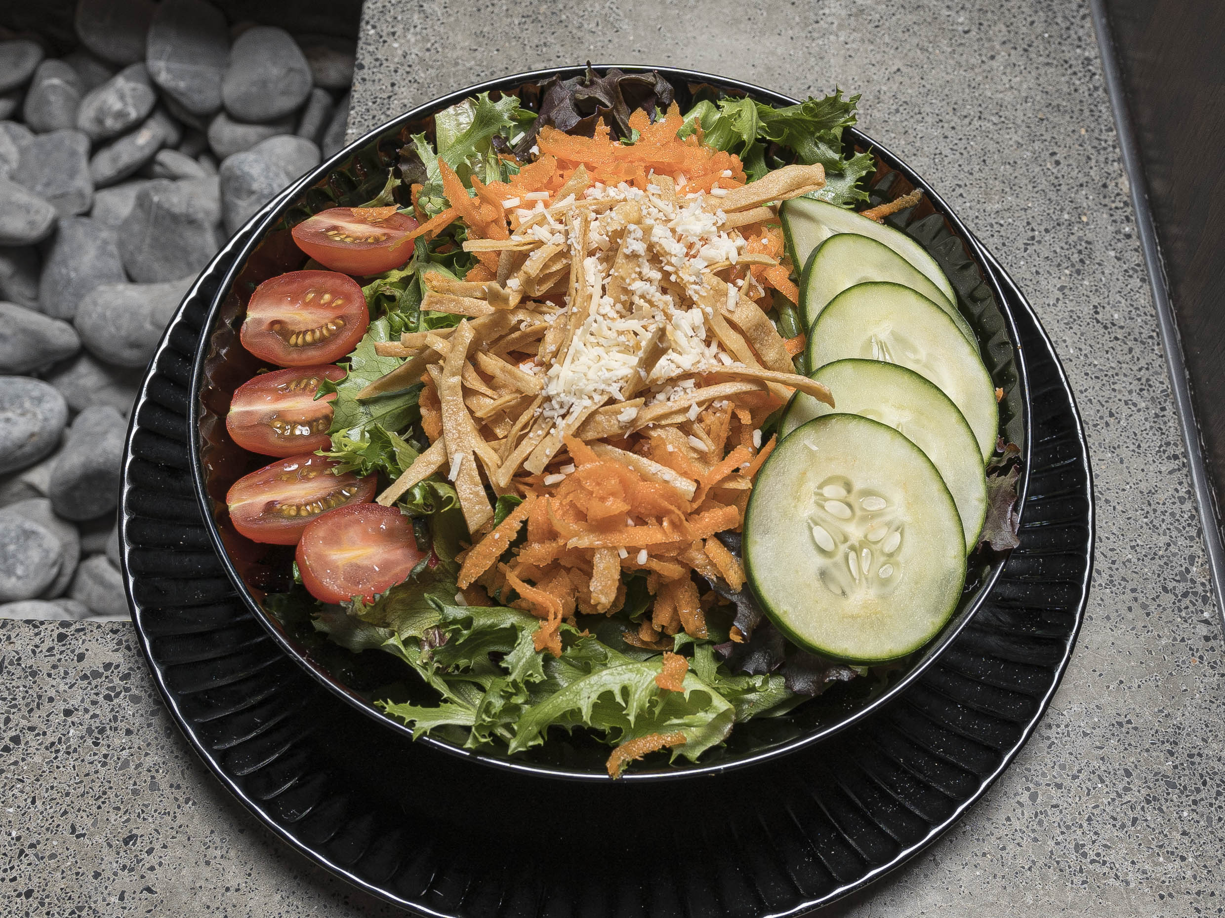 Lechuga, zanahoria, pepino, tomate cherry, queso parmesano rallado y chips de tortilla, Servida con Nuestro Aderezo hecho en casa a base de mayonesa con un toque cítrico.