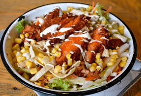 Lechuga Orejona, Zanahoria, Jícama, Apio, Queso Cheddar, Tocino, Crujiente, Chips de Tortilla y Tiras de Pollo Empanizado Bañados en Salsa Búfalo, Servida con Aderezo Ranch.