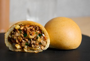 Mollete con chorizo. Lleva frijoles, chorizo, queso asadero y pan con queso gratinado.