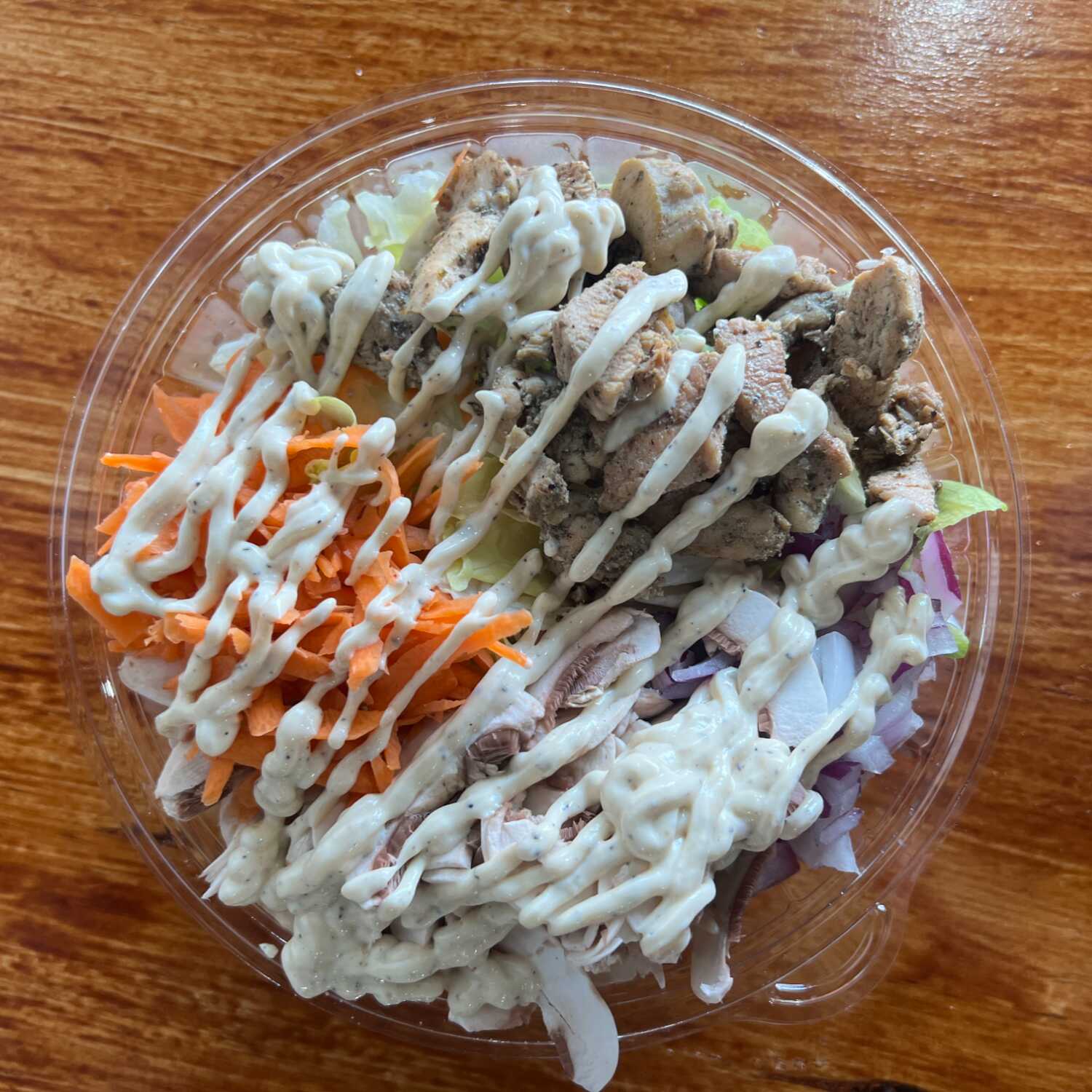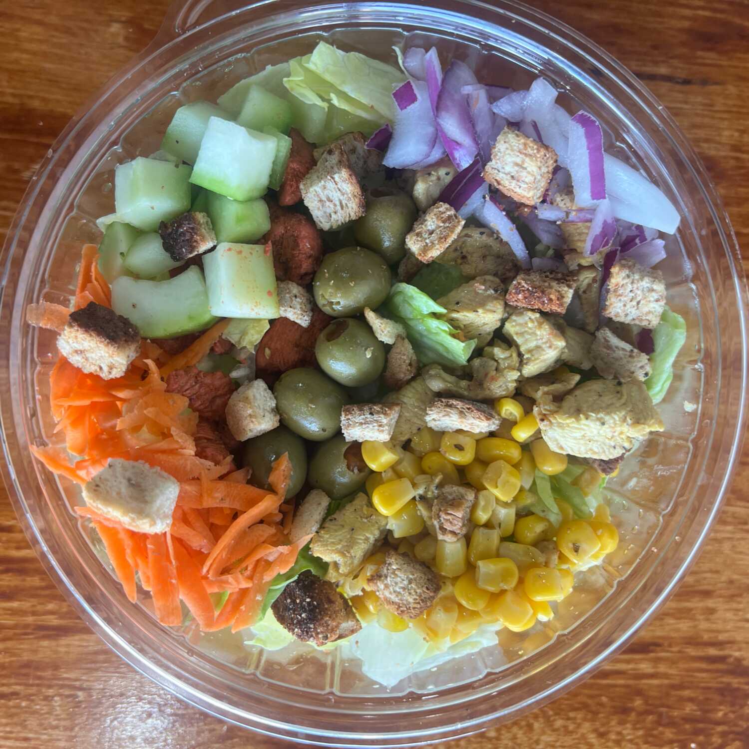 150g de pollo, 200g de lechuga, toppings, crotones o tortillas y aderezo.