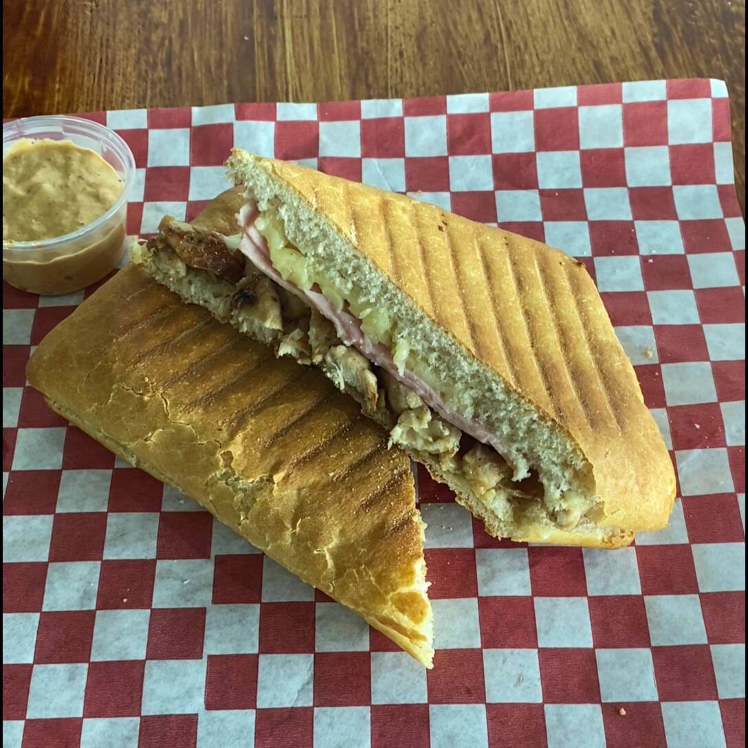 Pan Cibatta, 50g de pollo, 50g de jamón, topping y aderezo.