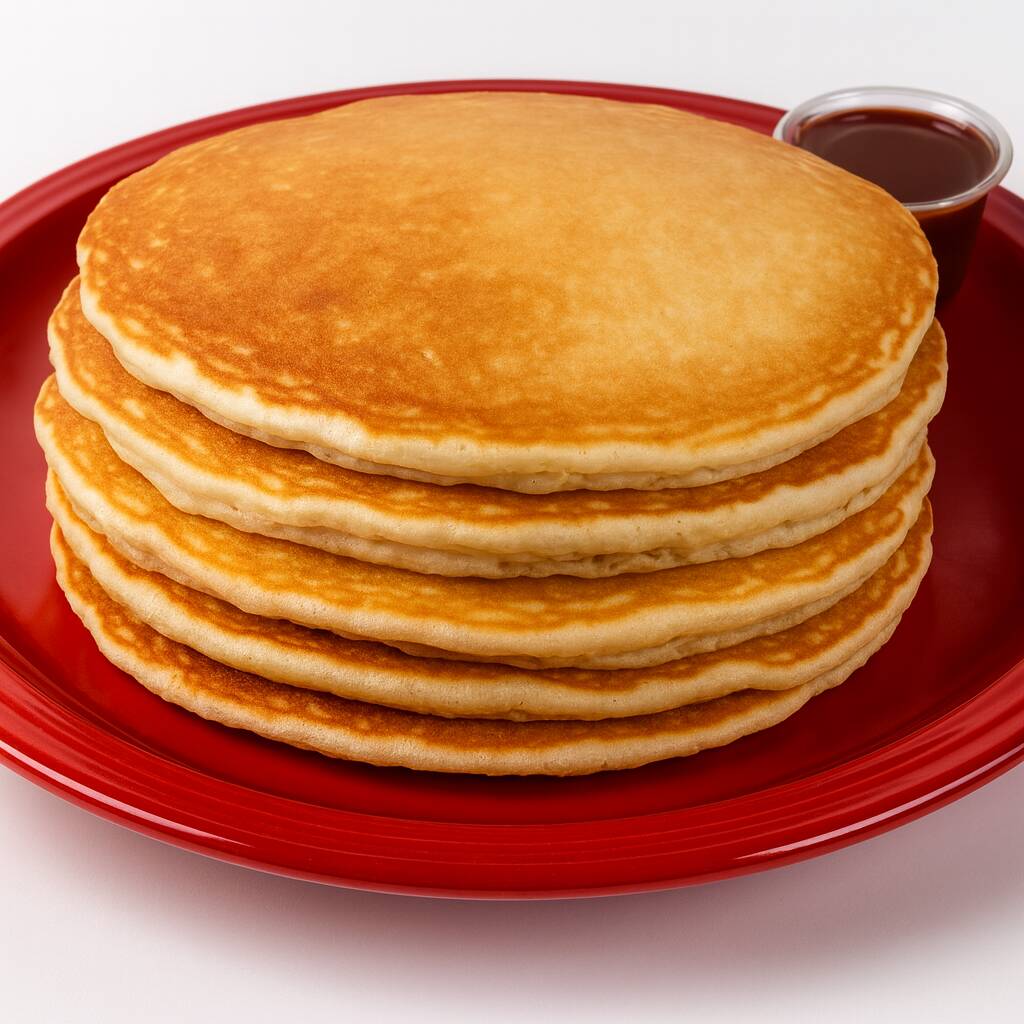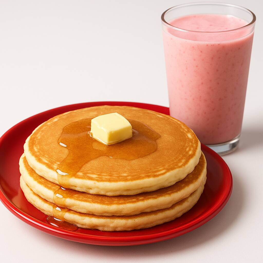 2 Piezas de hot cakes, 2 huevos estrellados, tocino, miel y 1 papa hash brown.