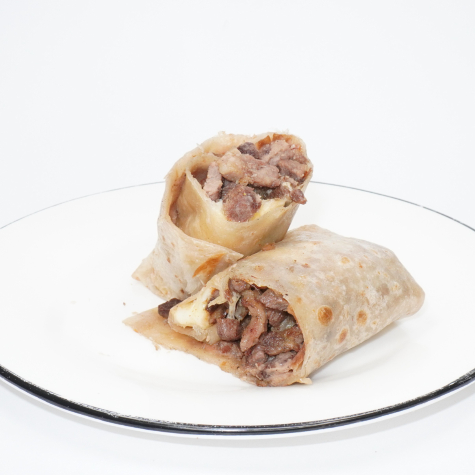 Tortilla de harina grande recién hecha, rellena de deliciosa carne asada al carbón, frijoles refritos y queso derretido.