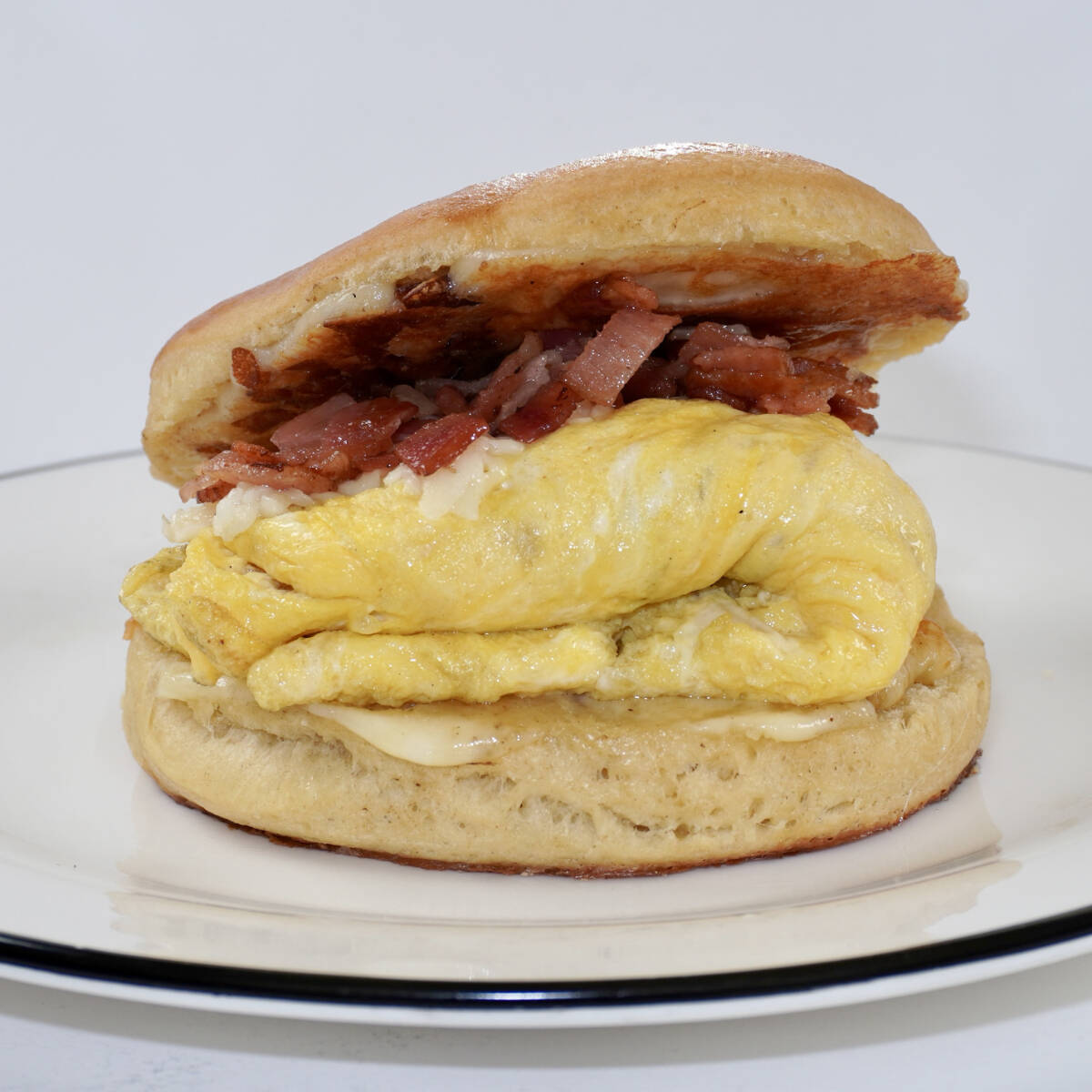 Delicioso pan biscuit con una costra de queso, una mini torta de huevo y tocino.
