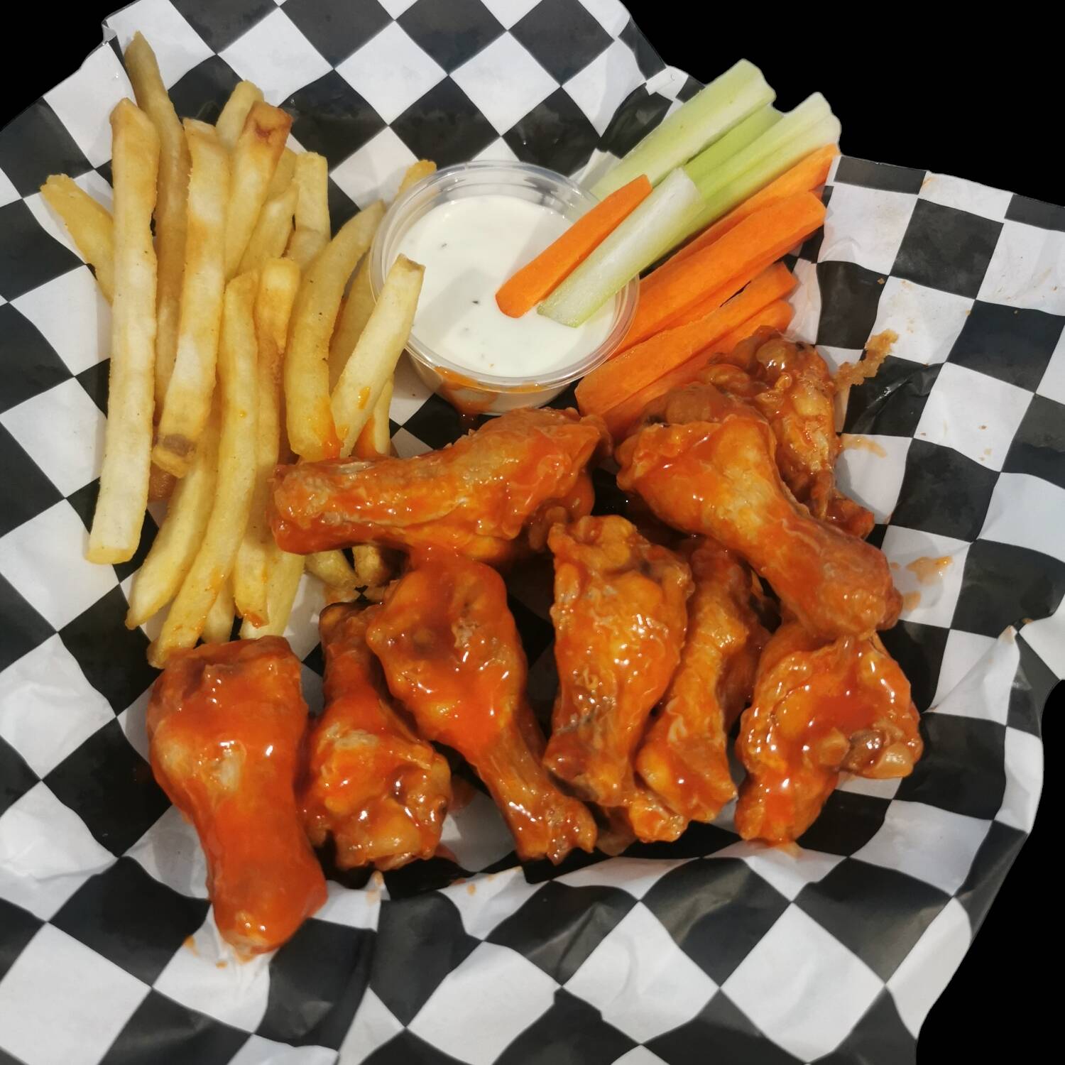 1/2kilo de exquisitas alitas , papás fritas , zanahoria , apio , aderezo rach