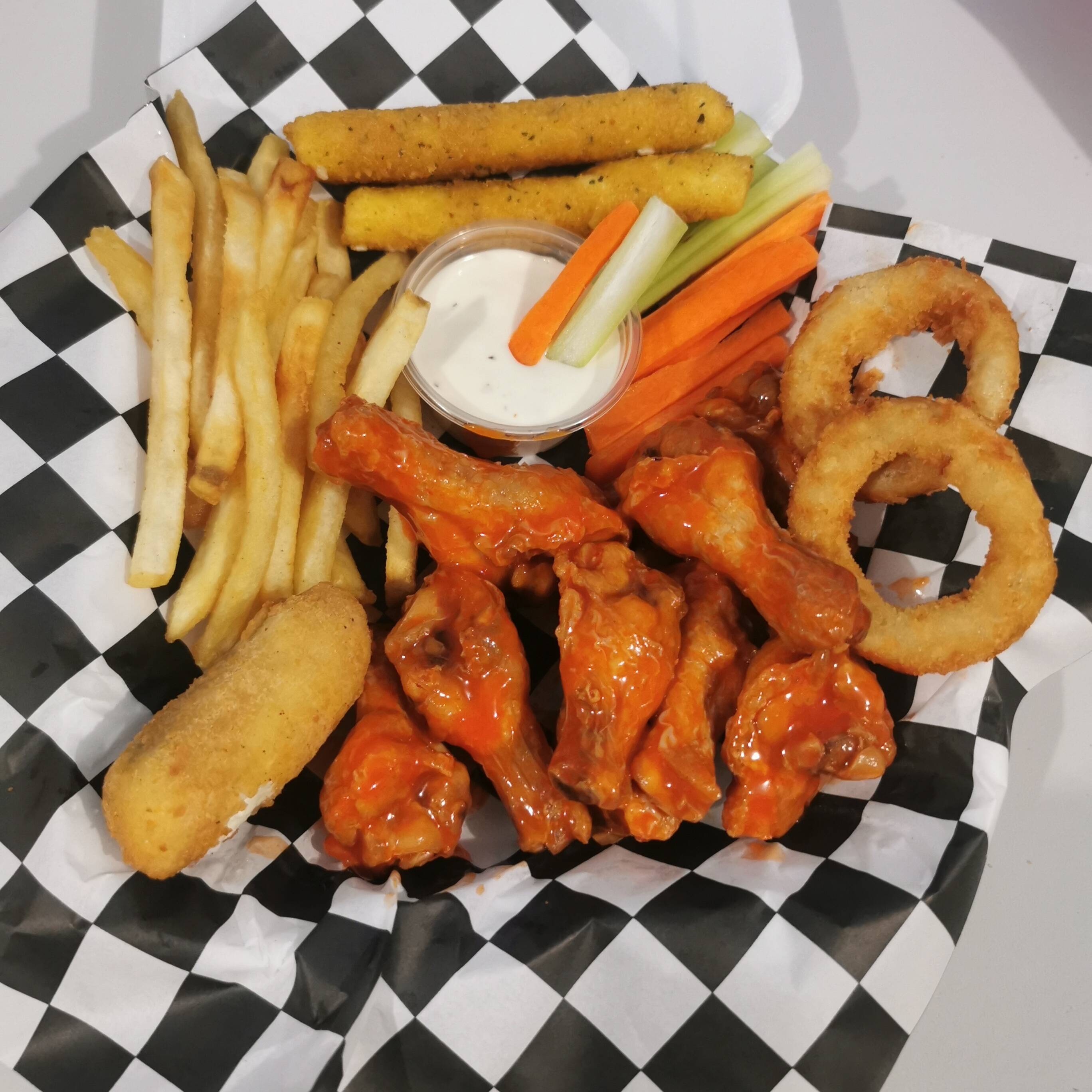 6 alitas , 3 dedos de queso , 3 aros de cebolla , papas fritas, aderezo rach