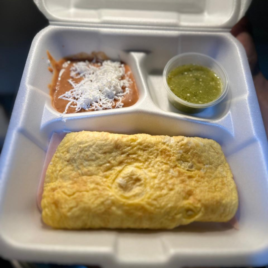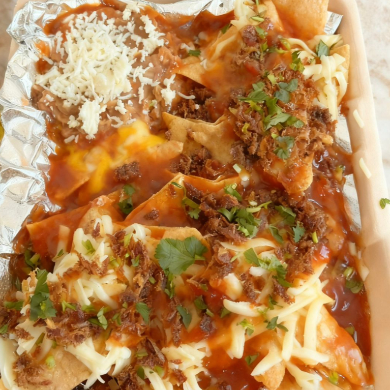 Totopo, machacado, salsa de su elección, crema, queso, frijoles refritos