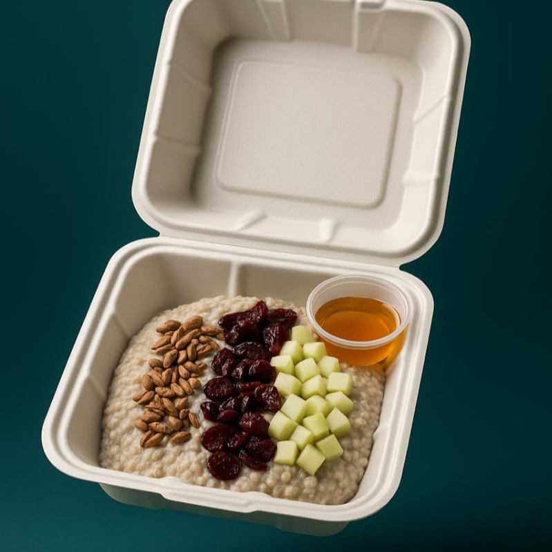 Avena, leche endulzada con vainilla y canela, acompañada de manzana, árandanos, nuez y miel