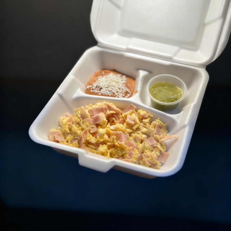 Totopo, doble proteína, pollo y huevo, salsa de su elección, crema, queso y frijol refrito