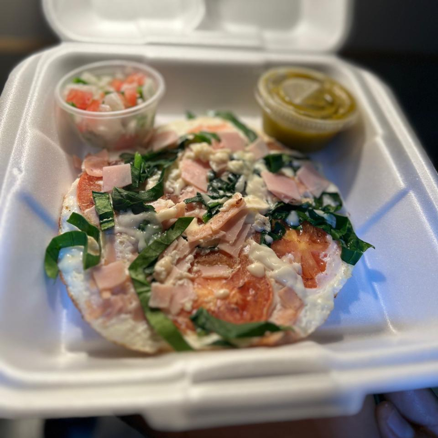 Totopo, 2 huevos estrellados, salsa de su elección, crema, queso y frijol refrito