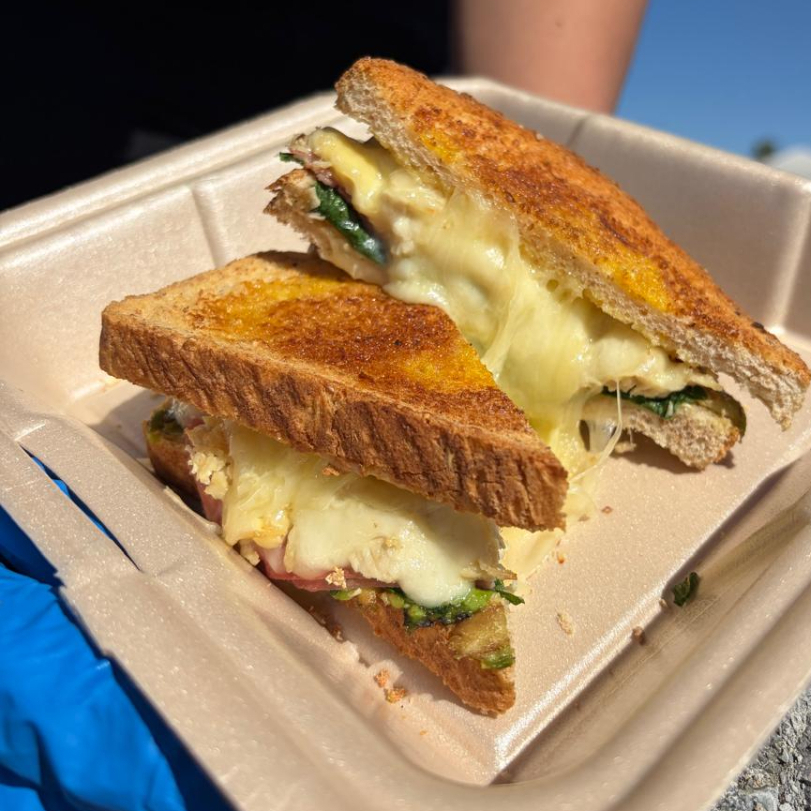 Pan integral, jamón de pavo, pollo, queso mty jack, aguacate, espinaca y aderezado con mayonesa y mostaza.