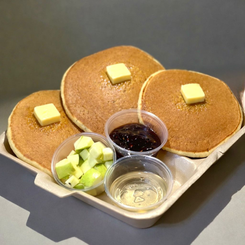 3 Piezas de esponjosos hot cakes, acompañados de cuadritos de manzana, miel, mantequilla y una deleitante mermelada de frutos rojos